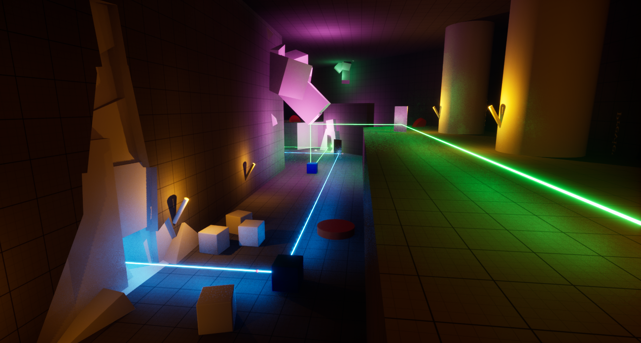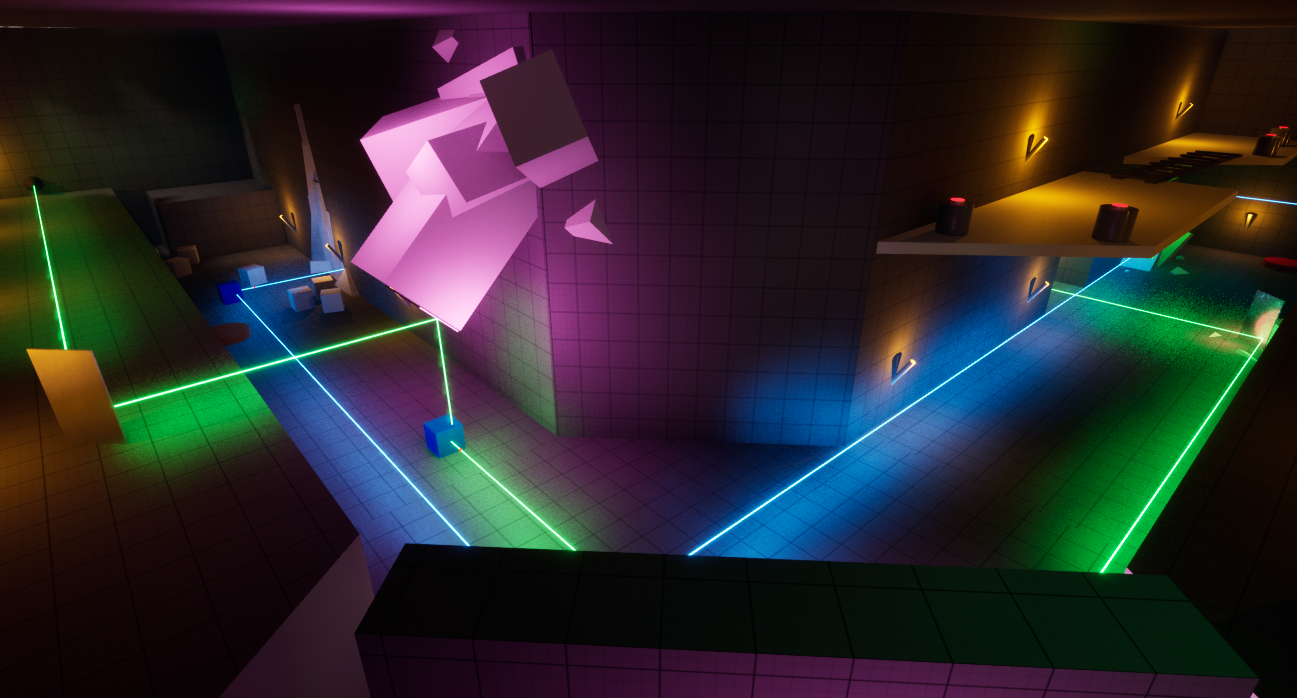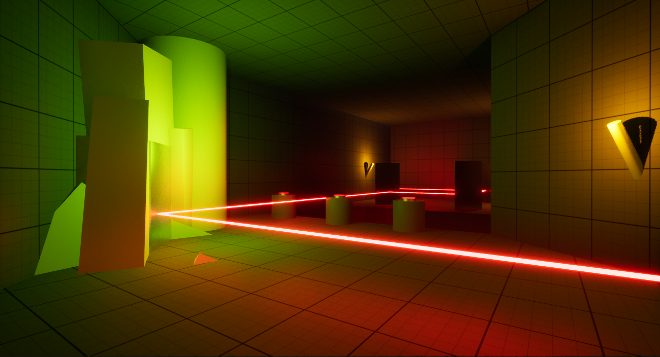 A puzzle adventure level where players reflect lasers to solve complex puzzles. Players progress through three sections of increasing complexity, using mirrors and environmental elements to redirect laser beams and solve puzzles. Through layers of intuitively taught, interconnected mechanics, players are encouraged to experiment and discover unique solutions to each challenge.