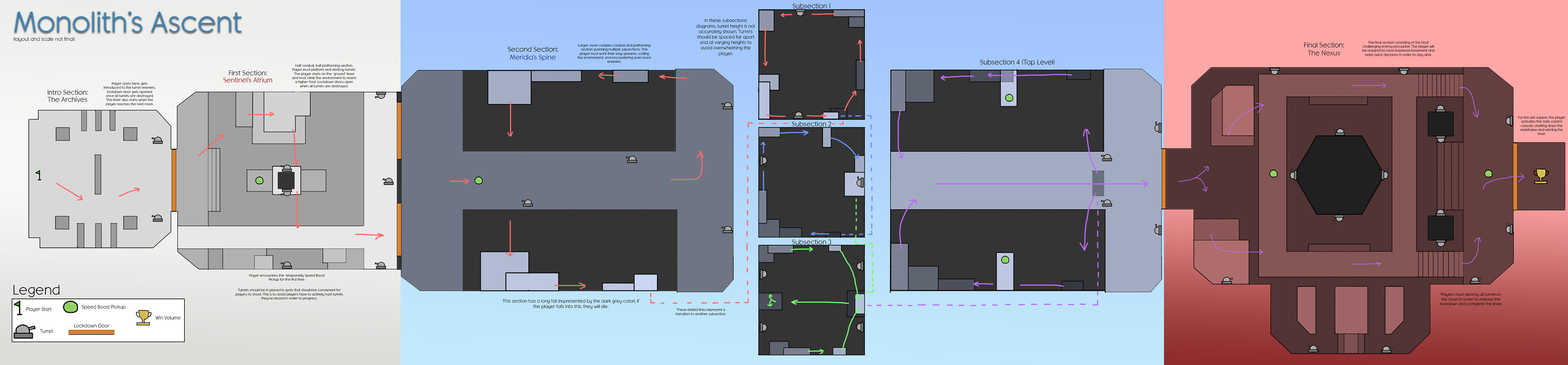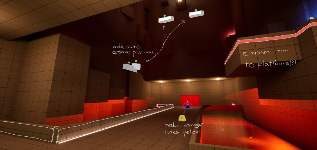 I began this project by designing and prototyping the main mechanics and systems of my level. I decided that my level would prioritize fast-paced combat, forcing players to balance fighting AI enemy turrets with platforming through the level's 3 primary sections. I prioritized these core values in my design: