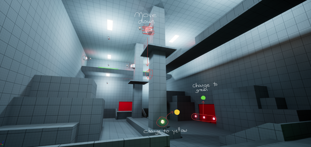 Vertical Platforming and Flow Design: Another major challenge I faced was how to balance a large vertically scaled level in a way that was fun and not confusing. My solution involved the placement of visual anchors (decals) and architectural elements to maintain a clear progression path while conveying building scale.