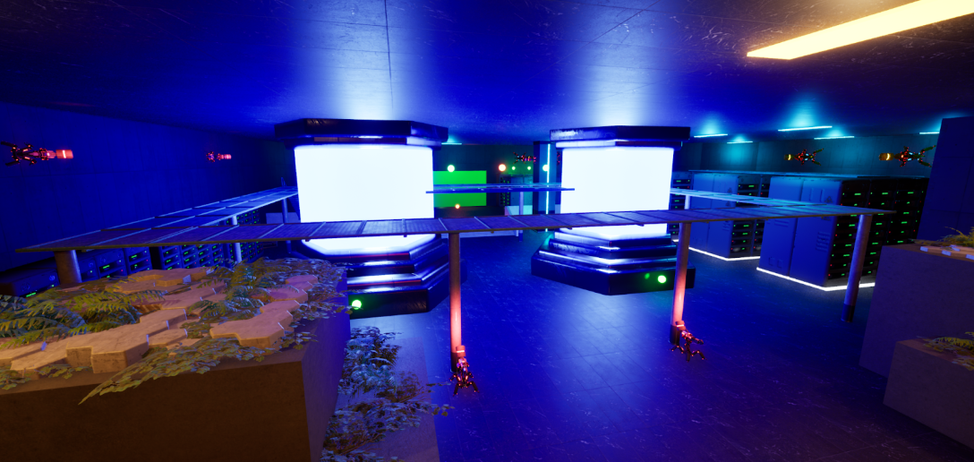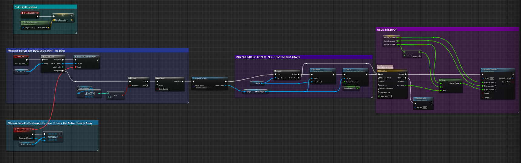 - Initially populates an array with references to all selected turrets. As players destroy those turrets, they are cleared one by one until the array is empty, which will then open the door and let the player progress to the next section.