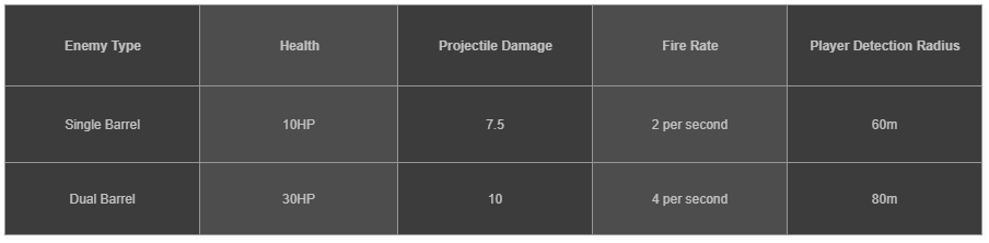 - Two enemy types: Single Barrel and Dual Barrel. Dual Barrel enemy types are introduced halfway through the level, dealing more damage, shooting faster, and having more health.