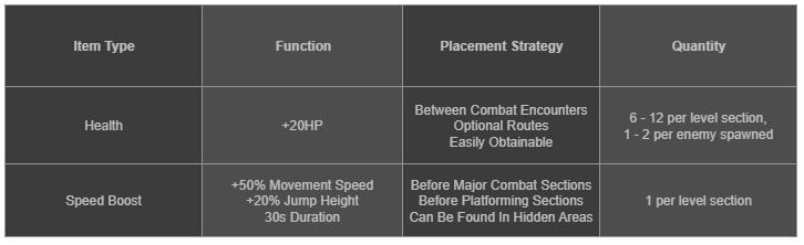 - Speed Boost pickups provide temporary movement enhancements, positioned before harder platforming sections and high-intensity zones, giving players frequent opportunities to give themselves advantages.