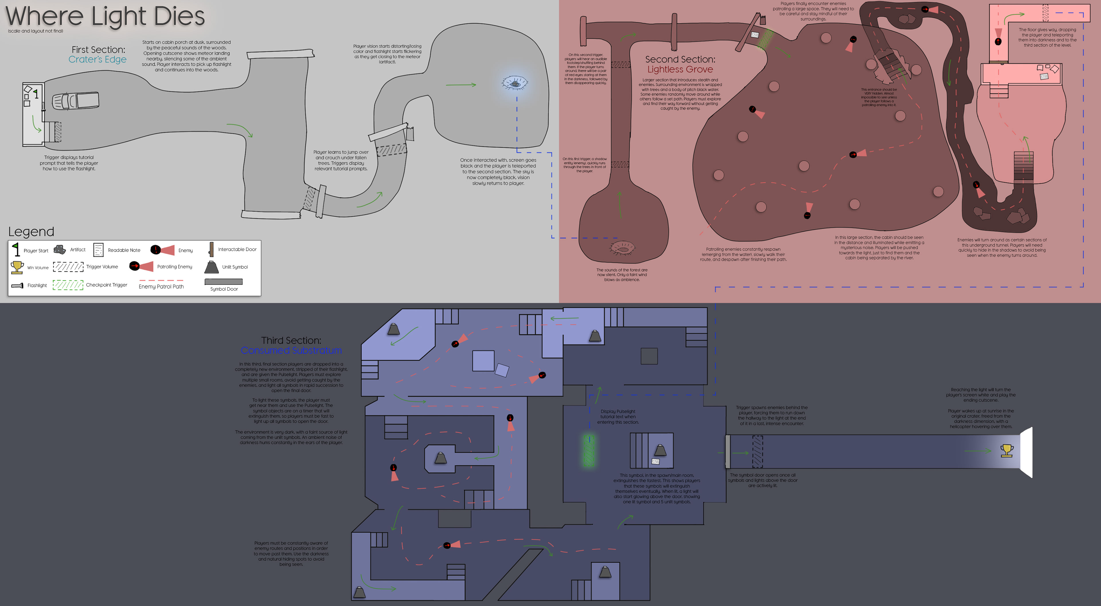 My primary design goal was to maintain an immersive, tense atmosphere using visuals and SFX for storytelling enhancement. I focused on teaching mechanics through environmental clues while balancing guidance with exploration.