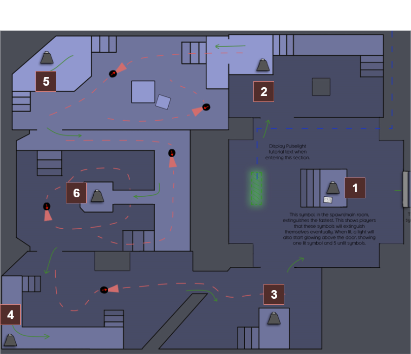 This puzzle sequence is the final test of the game. It is designed to push the player to conquer the dark, plan a perfect route, and avoid the enemies wandering the area, all while under a time constraint. The player needs to use their Pulselight Device to ignite 6 pedestals around the area in order to escape.